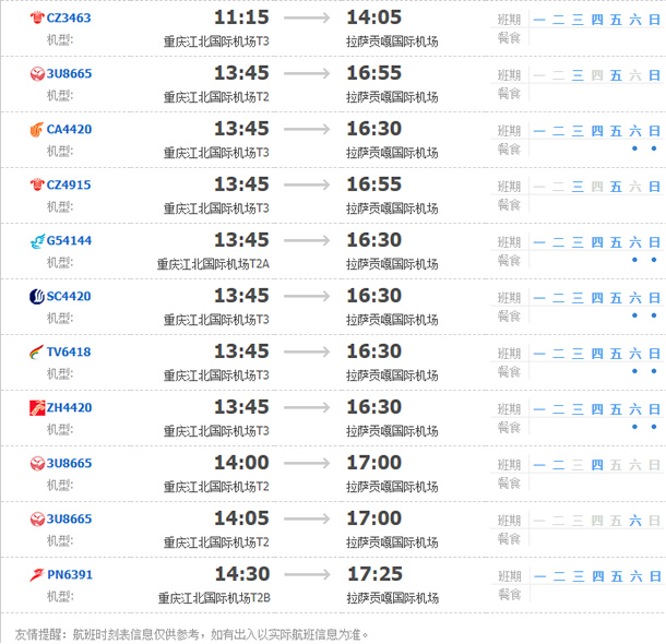 以上就是重慶飛拉薩的航班時刻表,起飛時間,到達時間,及固定航班日期。